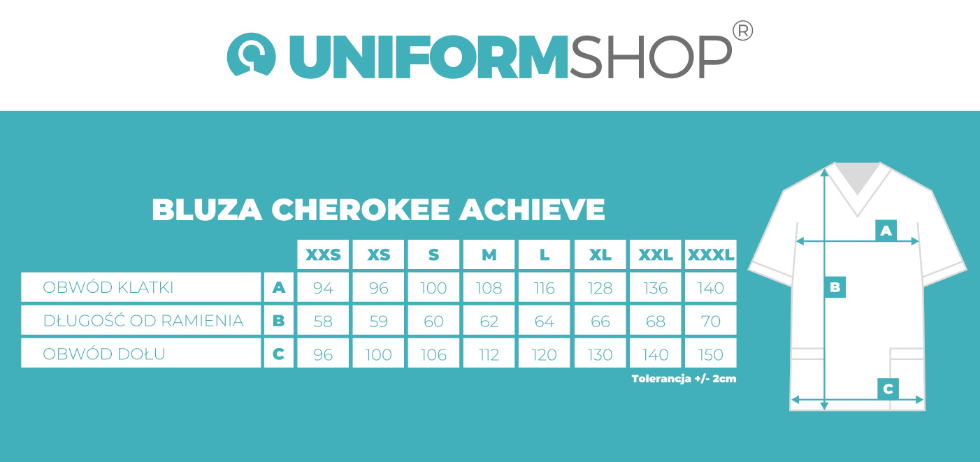 Bluza medyczna Cherokee Achieve wyróżnia się nowoczesnym krojem, który przełamuje schemat tradycyjnych uniformów. Rękawy typu raglan zapewniają pełną swobodę ruchów i nadają całości dynamicznego charakteru. Okrągły dekolt przy szyi subtelnie podkreśla minimalistyczny styl i odróżnia ten model od popularnych bluz z głębszymi wycięciami. Nieco krótszy fason sprawia, że bluza prezentuje się lekko i wyjątkowo nowocześnie. Dzięki swojemu designowi ta bluza świetnie sprawdzi się nie tylko w pracy, ale też jako stylowy element codziennej garderoby. Dlaczego nie połączyć profesjonalizmu z modnym, codziennym lookiem? :)