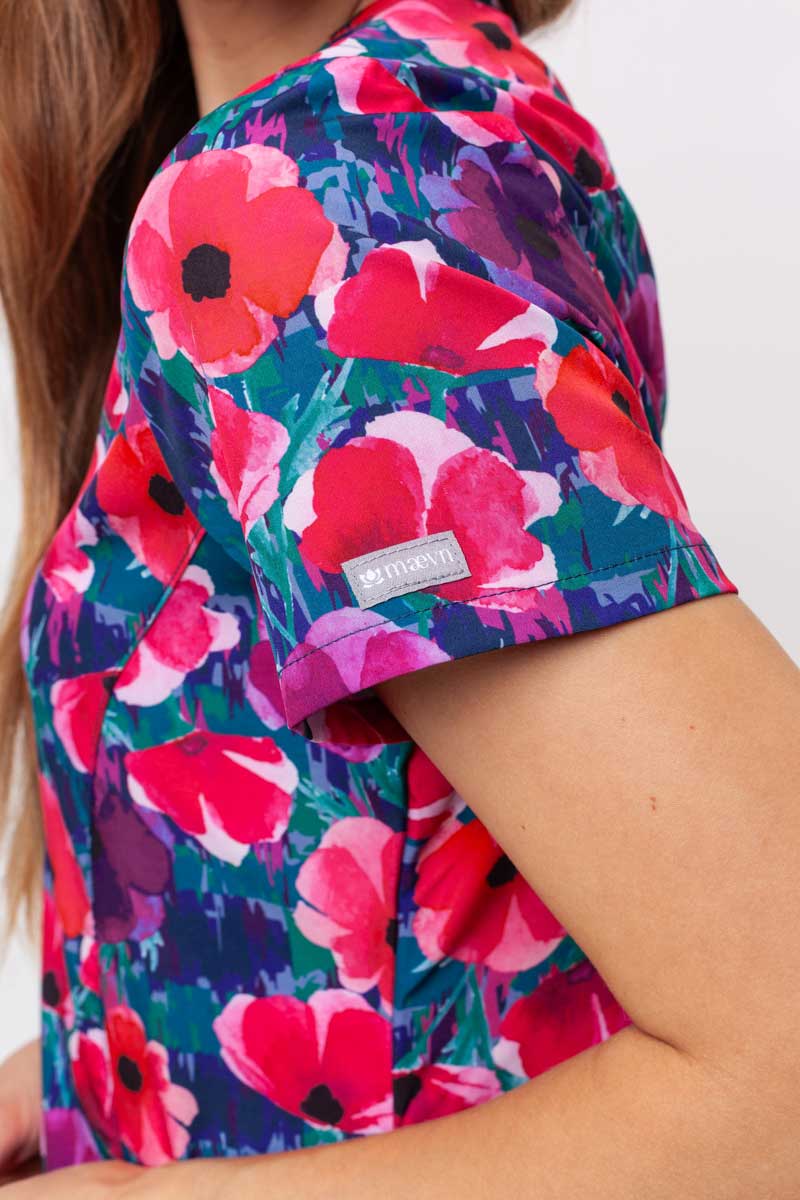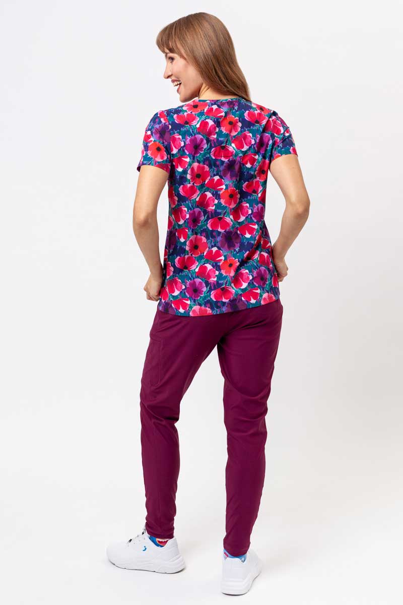 Spróbuj czegoś nowego z bluzą, która łączy wyrazisty print z dopracowanym krojem. Lekko zaokrąglony dekolt w kształcie litery V dodaje lekkości, a modelujące szwy z przodu subtelnie podkreślają sylwetkę. Oddychający materiał z dodatkiem spandexu gwarantuje pełną swobodę ruchów i komfort przez cały dzień. System wentylacji dba o świeżość, a wzmocnione kieszenie i podwójne szwy zapewniają niezawodną trwałość. Trzy praktyczne kieszenie pozwalają mieć wszystko, co potrzebne, zawsze w zasięgu ręki. To połączenie funkcjonalności i nowoczesnego stylu, które sprawią, że codzienny uniform nabiera nowego charakteru.