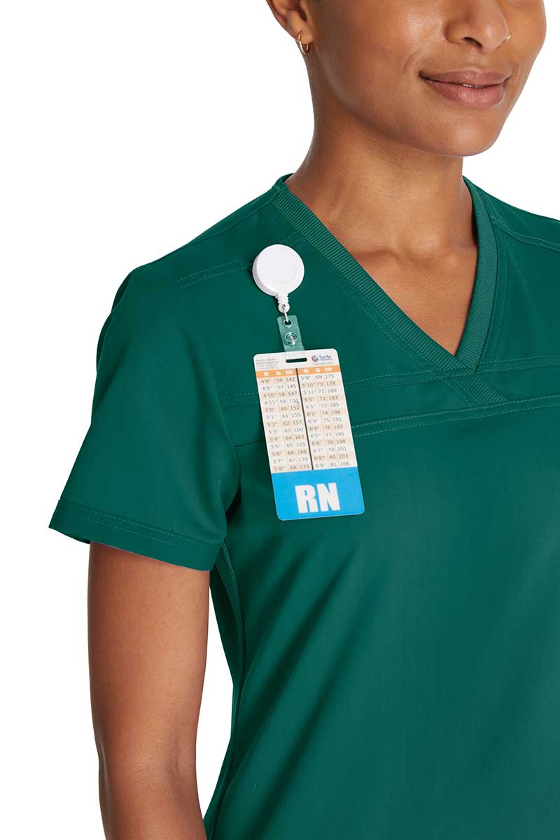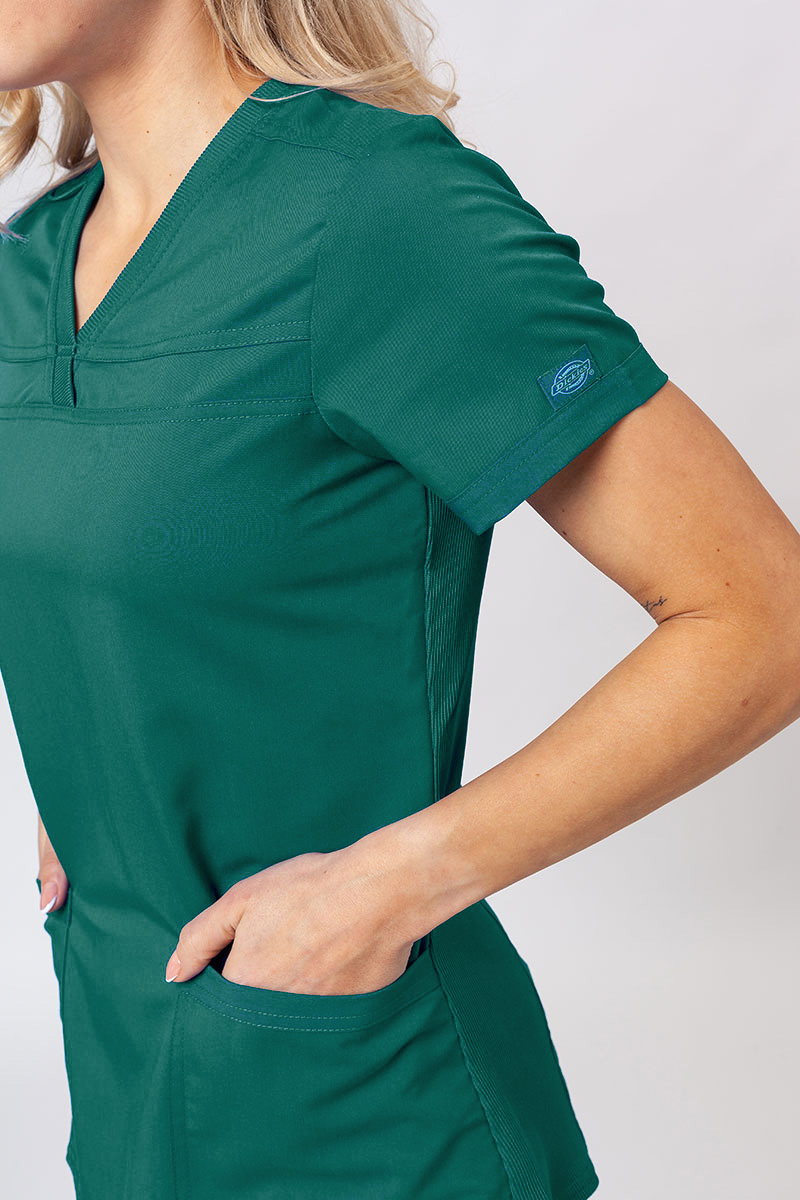 Świetnie odszyty i praktyczny komplet medyczny firmy Dickies to zestawienie stylowej bluzy o nowoczesnym kroju z dekoltem w szpic, który jest wykończony tkaniną dzianinową, podobnie jak tylne panele zapewniające swobodę ruchów oraz nowoczesnych spodni o kroju ze średnim stanem, zwężanymi nogawkami i elastycznym pasem wyposażonym w wewnętrzny sznurek do dodatkowej regulacji. Oba produkty uszyte są z wygodnej i miękkiej tkaniny z dodatkiem sztucznego jedwabiu i elastanu, którą prać można w 60°C!