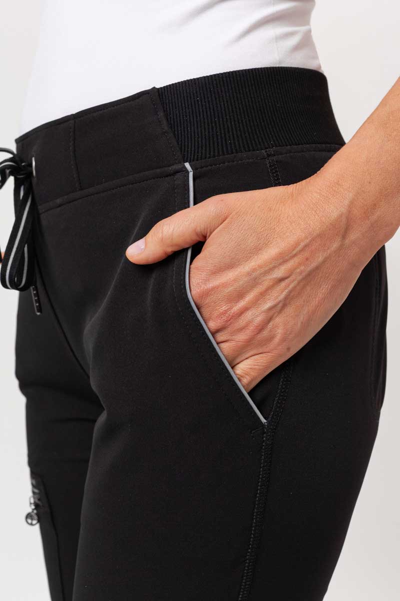 Lamówki migoczą przy każdym ruchu, a dopasowane sylwetki bluzy i spodni nadają uniformowi lekko sportowego, nowoczesnego charakteru. Dekolt na zamek, modelujące szwy i subtelne detale w bluzie podkreślają figurę, nadając jej wyrafinowany twist, a proste spodnie z odblaskowymi lamówkami przy kieszeniach i dwukolorowym troczkiem tworzą spójną, harmonijną linię. Pięć praktycznych kieszeni mieści wszystko, czego potrzebujesz w pracy, a miękka, elastyczna w czterech kierunkach tkanina odprowadza wilgoć, zachowuje kolor i zapewnia komfort przez cały dzień. Ten komplet to połączenie wygody, funkcjonalności i stylu - uniform, który naprawdę przyciąga wzrok.