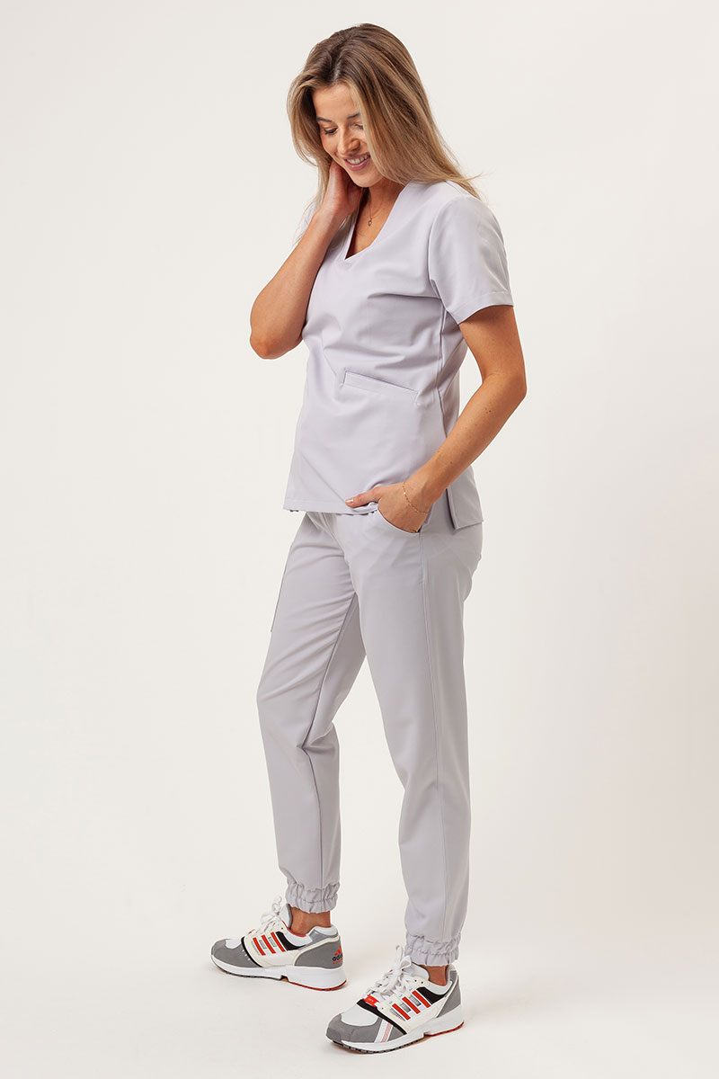 Odzież medyczna, za którą zatęsknisz, kiedy będzie w praniu? To musi być widoczny na zdjęciach komplet z linii Sunrise Uniforms Premium. Tworzy nowoczesny, wyróżniający się look, utrzymany w eleganckiej, sportowej estetyce. Składa się z komfortowej bluzy z krótkim rękawem i kunsztownie wykończonym dekoltem w literę V oraz spodni joggerów z szeroką gumą w pasie, funkcjonalnie zaprojektowanymi kieszeniami – w tym jedną cargo – i ściągaczami u dołu nogawek. Całość wykonana z solidnego, przyjemnego dla skóry materiału z dodatkiem spandexu, porządnie odszyta, dostępna w wielu wariantach kolorystycznych. Podczas noszenia ujawni Ci całą resztę swoich atutów.