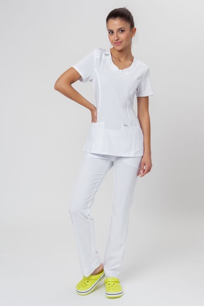 Idealnie dopasowane, elastyczne, z modnie rozszerzającą się ku dołowi nogawką – to spodnie medyczne Cherokee Infinity w pełnej krasie. Materiał jest wytrzymały, dostosowuje się do ciała, jest łatwy w utrzymaniu w świetnej formie. Przeszycia imitują dżinsowy design, ale w pasie znajdziesz szeroką gumę, która zapewni Ci komfort i dopasowanie. Delikatnie zarysowane kieszenie są pojemne – idealne na telefon, mały notes i przybory do pisania. Dzięki mankietom i rozcięciom u dołu spodnie doskonale leżą i nie podwijają się nieestetycznie na butach. Ideał! ;)
