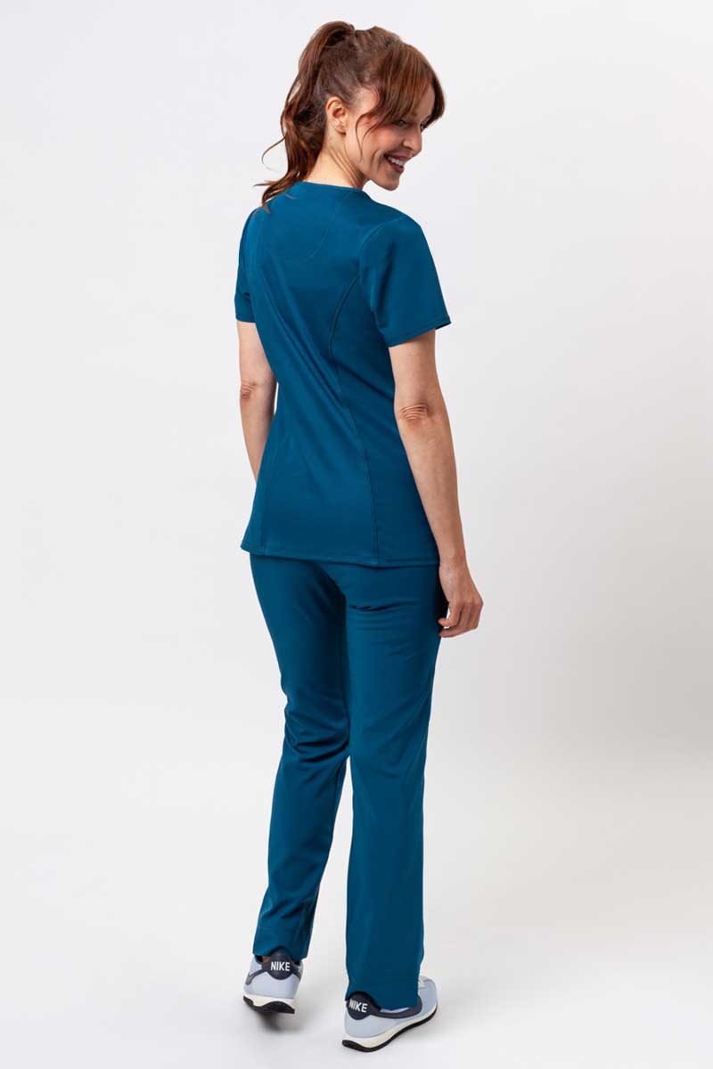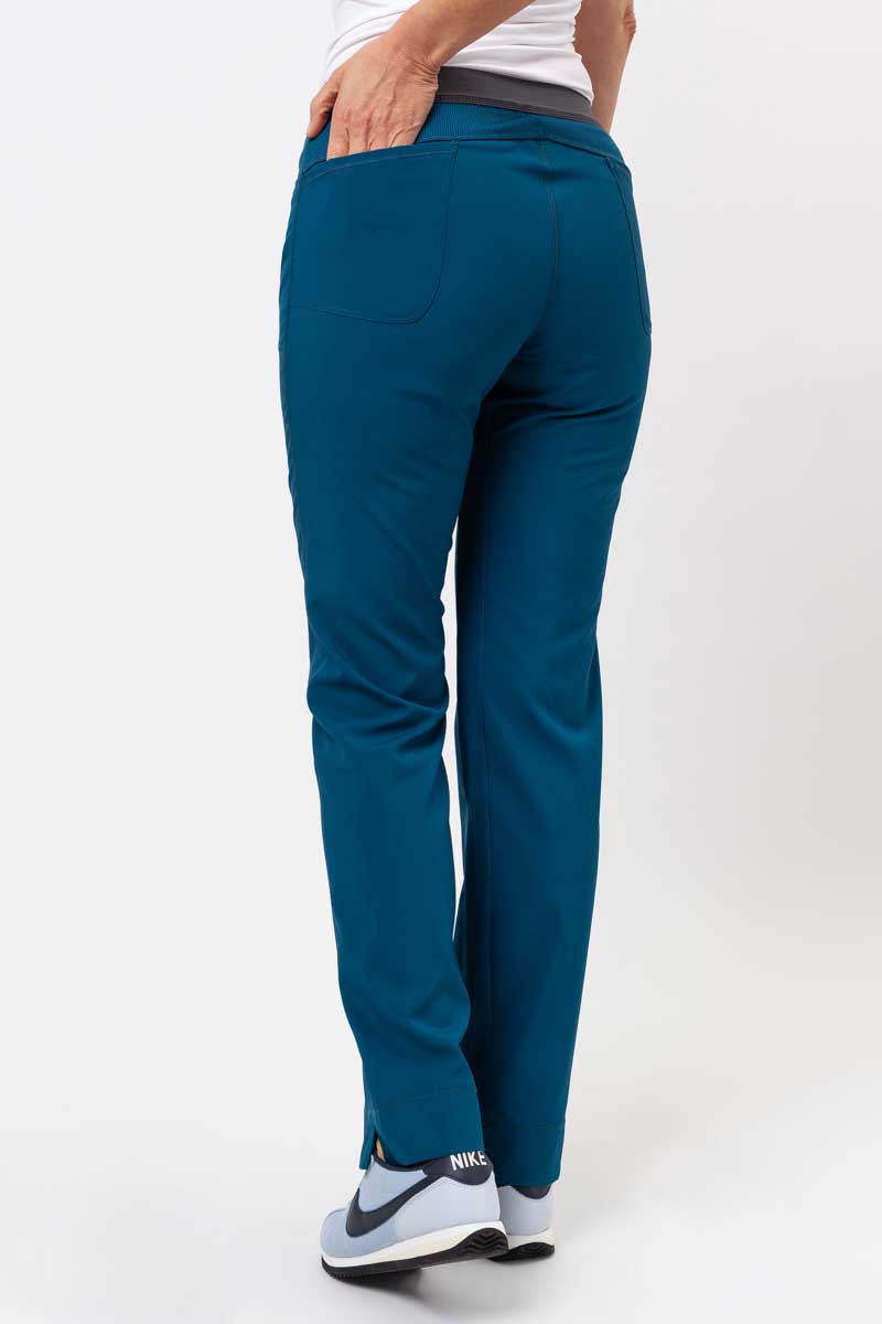 Idealnie dopasowane, elastyczne, z modnie rozszerzającą się ku dołowi nogawką – to spodnie medyczne Cherokee Infinity w pełnej krasie. Materiał jest wytrzymały, dostosowuje się do ciała, jest łatwy w utrzymaniu w świetnej formie. Przeszycia imitują dżinsowy design, ale w pasie znajdziesz szeroką gumę, która zapewni Ci komfort i dopasowanie. Delikatnie zarysowane kieszenie są pojemne – idealne na telefon, mały notes i przybory do pisania. Dzięki mankietom i rozcięciom u dołu spodnie doskonale leżą i nie podwijają się nieestetycznie na butach. Ideał! ;)