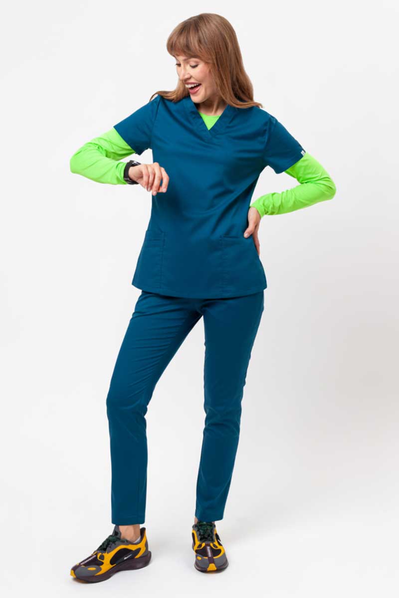 Szukasz bluzy, która dobrze się nosi i nie krępuje ruchów? Alyssa to połączenie wygody i klasy, która nie wymaga kompromisów. Dekolt w serek i lekko taliowany krój robią robotę — bez zbędnego luzu, ale i bez ucisku. Elastyczna, miękka tkanina to gwarancja komfortu na każdym ruchu, a boczne wcięcia dodają swobody tam, gdzie najbardziej jej potrzebujesz. Trzy dolne kieszenie i pętelka na identyfikator to praktyka w najlepszym wydaniu. To model dla tych, którzy nie chcą wybierać między wygodą a profesjonalnym wyglądem — bo jedno nie wyklucza drugiego.